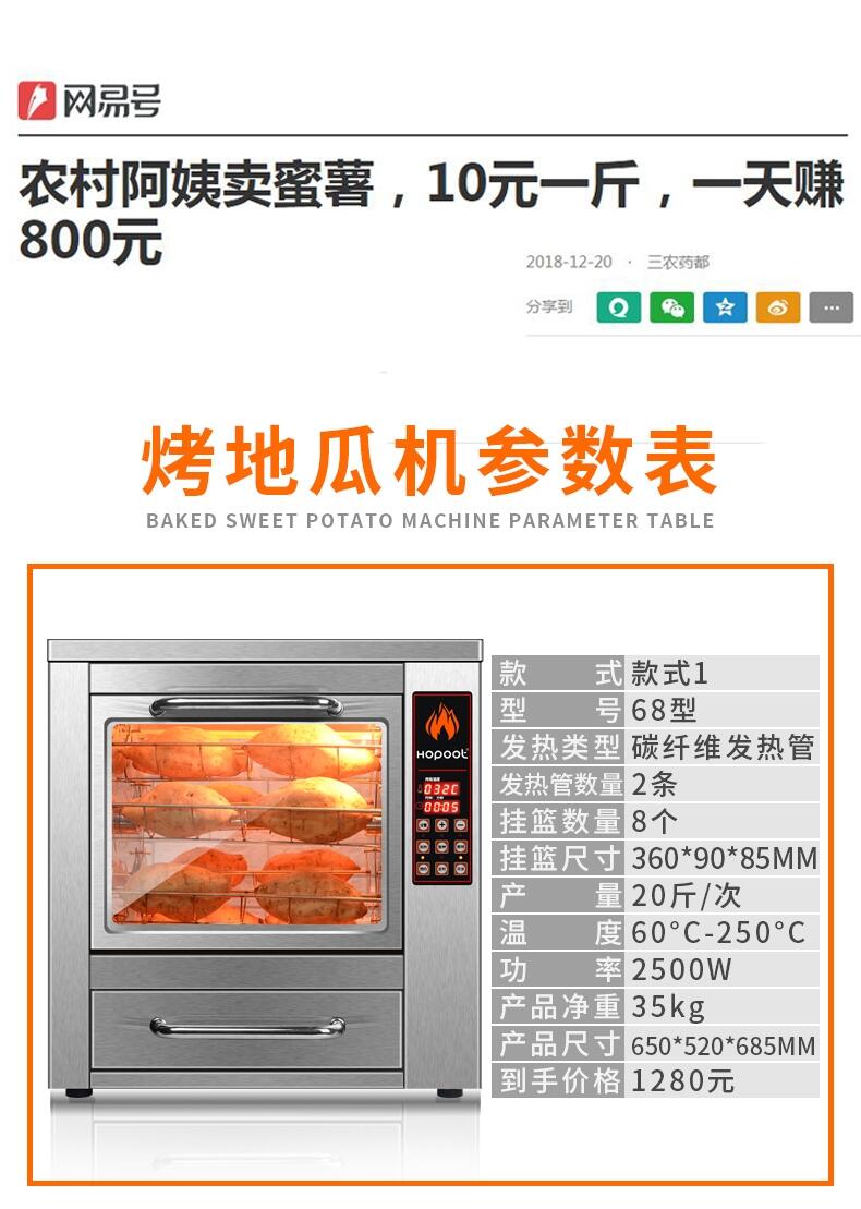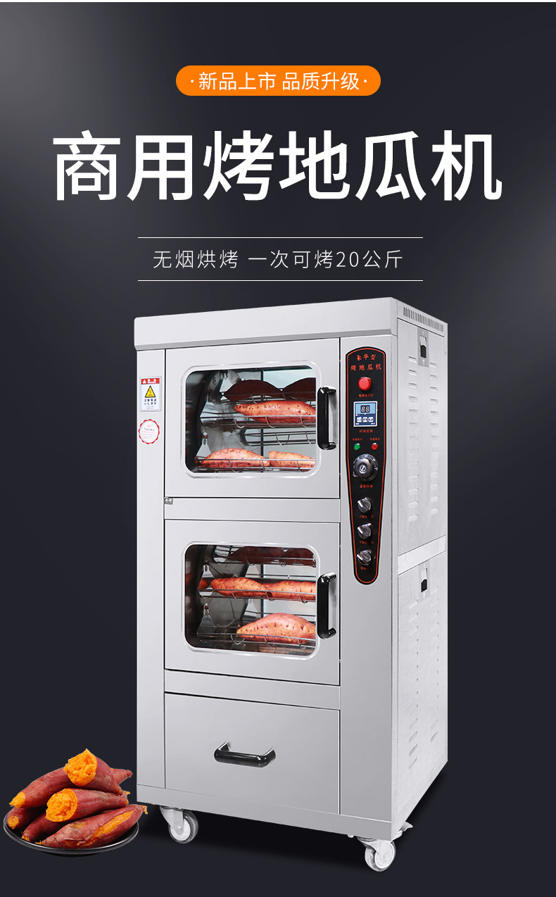 3、操作簡(jiǎn)便:最新烤地瓜機的設計人性化,操作非常簡(jiǎn)單,只需將地瓜放入機器,設置好烤制模式和時(shí)間,便可輕松完成烤制,無(wú)需看管。